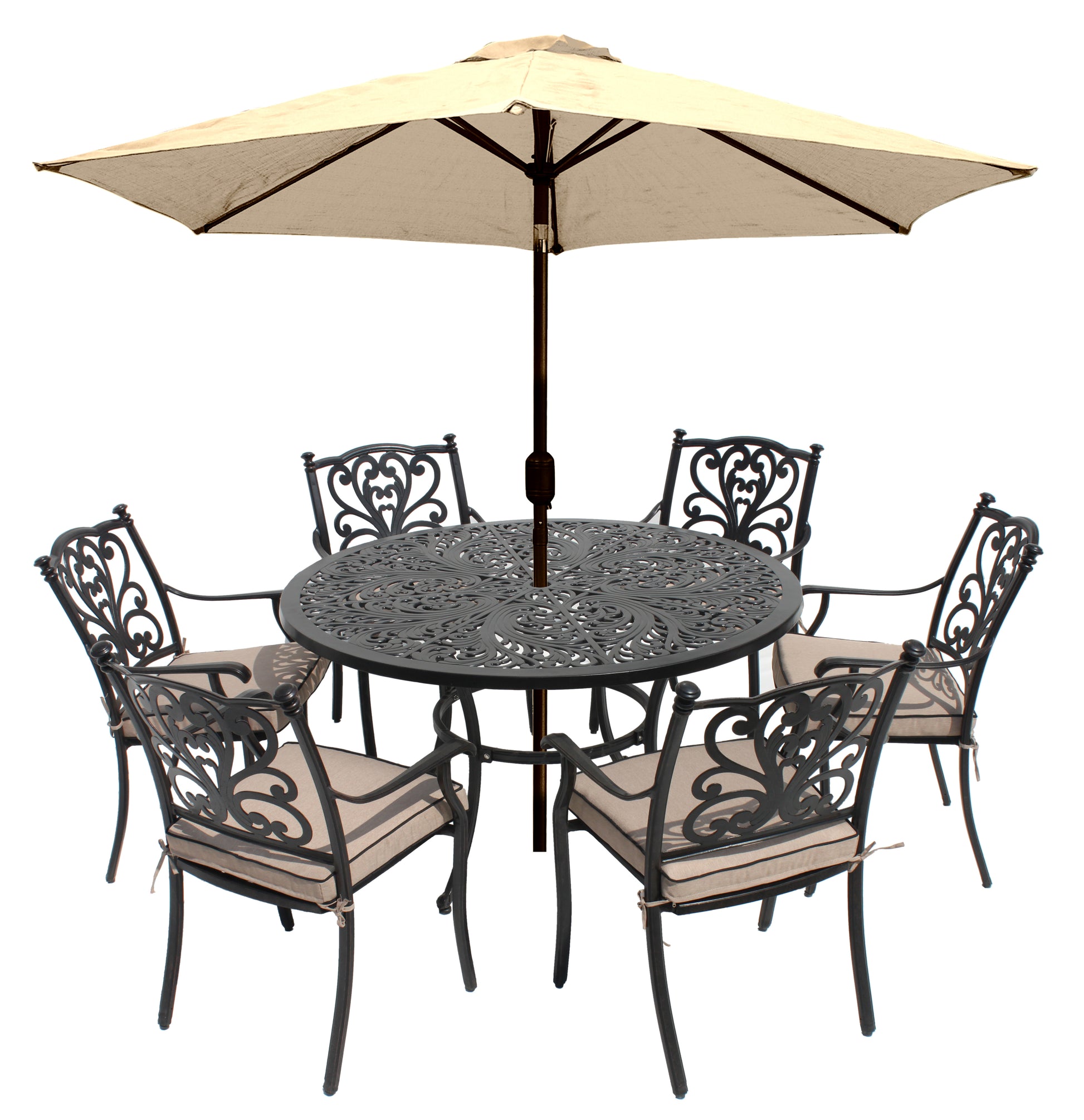 The Devon features classic intricate scroll detailing crafted, finished in an elegant bronze colour. Its made from durable cast aluminium designed to be easy-maintenance outdoors. The Devon 6 Seat Dining set includes 6x Devon armchairs with cushions and Devon Dining table plus 3m crank and tilt parasol.