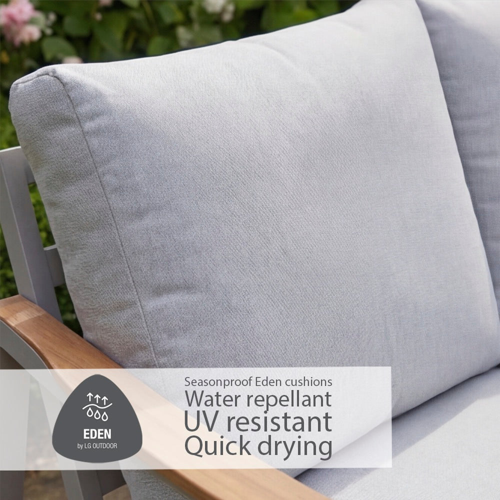 Off-white cushions feature Eden season-proof fabric—water-repellent, UV-resistant, and quick-drying. StainSafe coating makes spills easy to wipe away, while EcoCore fillings, made from recycled plastic bottles, deliver sustainable, eco-friendly comfort.