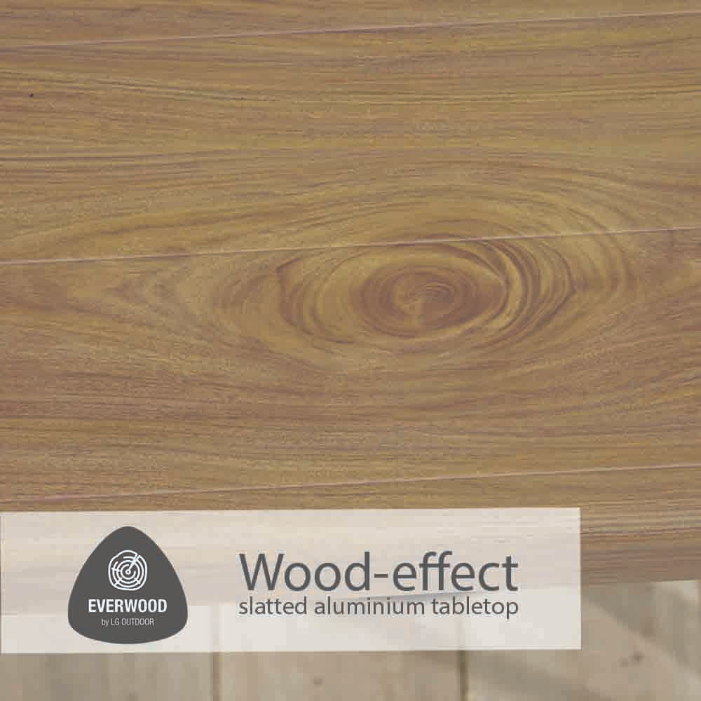 The Lisbon collection pairs classic wood-effect tabletops with pale grey aluminium frames for a timeless, contemporary look. The rich teak-effect heat transfer finish creates a warm, natural appearance, beautifully complemented by the light grey aluminium structure.