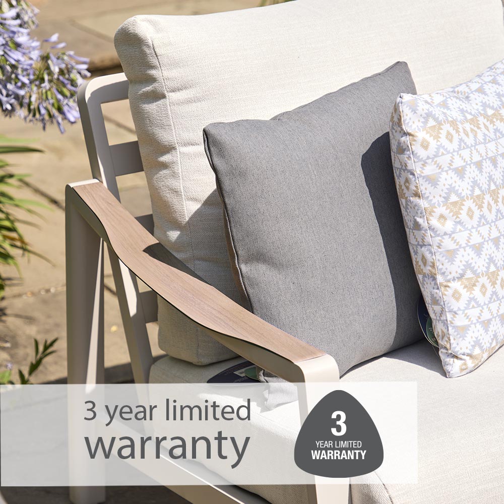Off-white cushions feature Eden season-proof fabric—water-repellent, UV-resistant, and quick-drying. StainSafe coating makes spills easy to wipe away, while EcoCore fillings, made from recycled plastic bottles, deliver sustainable, eco-friendly comfort.