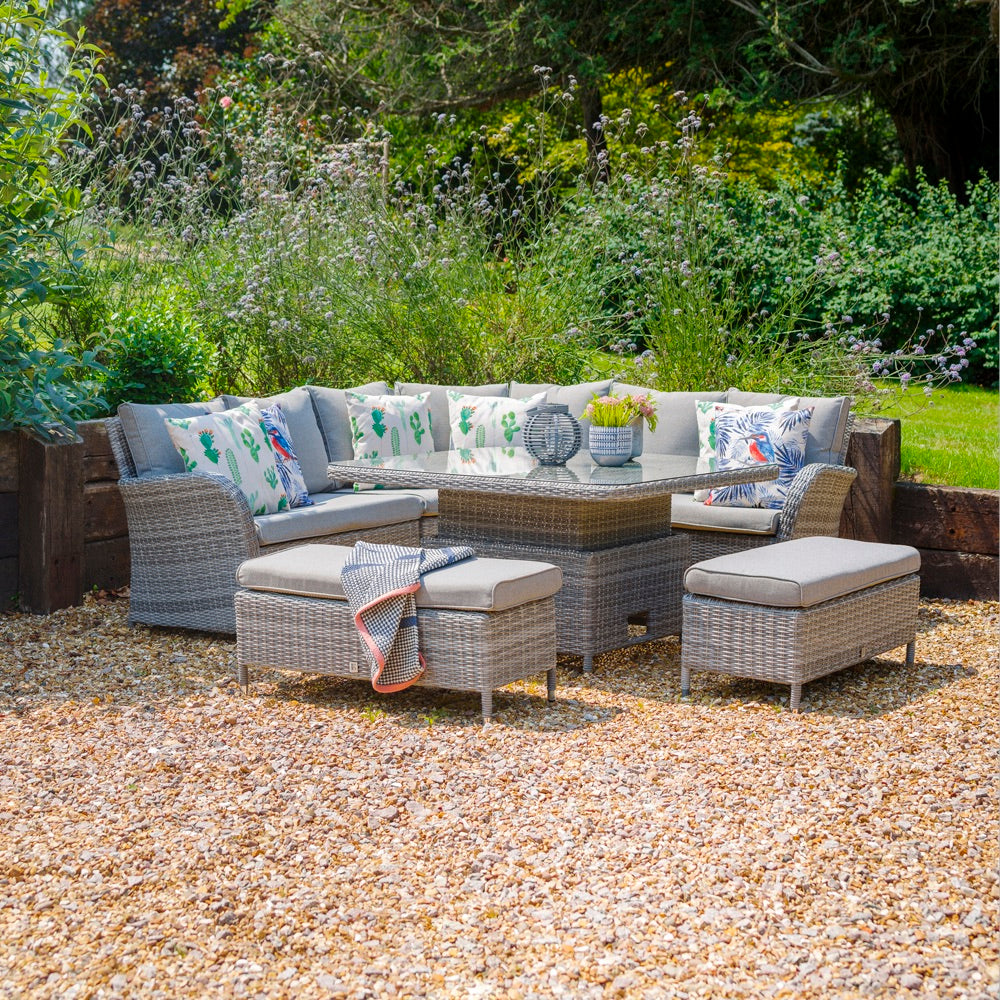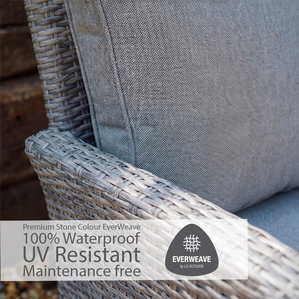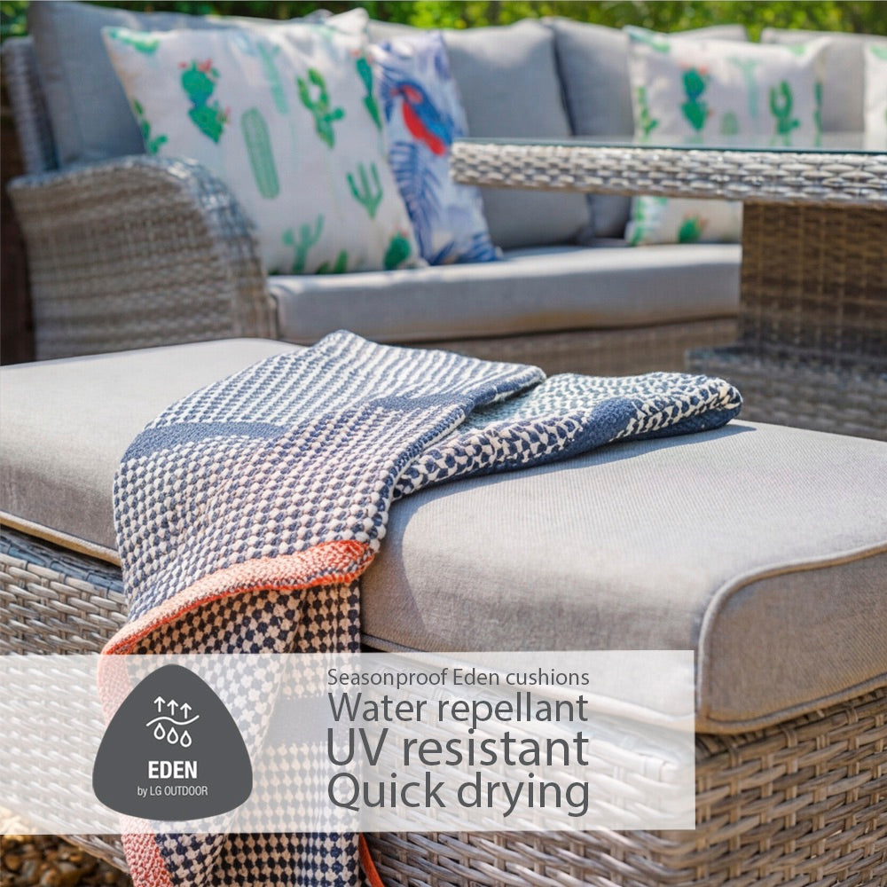 The cushions on our dining and lounge sets come with three multi-functional features making them super-durable for outdoor use.At LG Outdoor we know how unpredictable the summer weather can be, that’s why our eden Season-proof Cushions are water-repellent as well as quick drying, so you can leave them outside during those annoying summer showers. And for prolonged outdoor use they’re also UV resistant. Unlike other waterproof cushions, eden SeasonProof Cushions are soft to the touch, and super-comfortable thanks to our natural-feel fabric.
