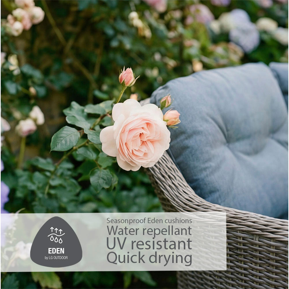 The cushions on our dining and lounge sets come with three multi-functional features making them super-durable for outdoor use.At LG Outdoor we know how unpredictable the summer weather can be, that’s why our eden Season-proof Cushions are water-repellent as well as quick drying, so you can leave them outside during those annoying summer showers. And for prolonged outdoor use they’re also UV resistant. Unlike other waterproof cushions, eden SeasonProof Cushions are soft to the touch, and super-comfortable thanks to our natural-feel fabric.
