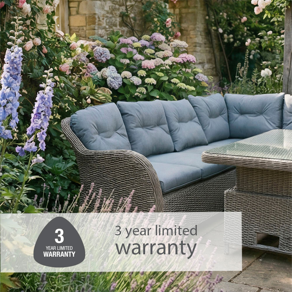 The Oslo Rectangular Dining Modular is made from premium handwoven poly-rattan Everweave and comprises of left, right, middle and corner sofas, double footstool and adjustable dining table which goes from low coffee table to high dining table easily. Includes our Eden Seasonproof seat and back cushions. Our Everweave is UV resistant with an authentic natural wicker effect with Rod Weave detailing, woven over an all-weather powder-coated lightweight aluminium frame. With safety glass table tops. 3 year limited warranty.