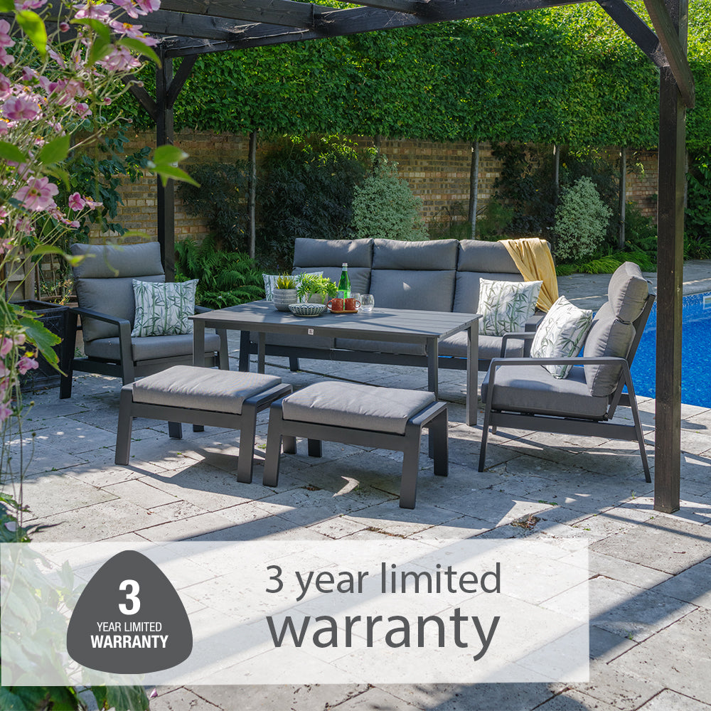 High chair backs, generous deep seats, and reclining seat options make the Santorini range super comfortable. Graphite grey aluminium frames with dark grey cushions.