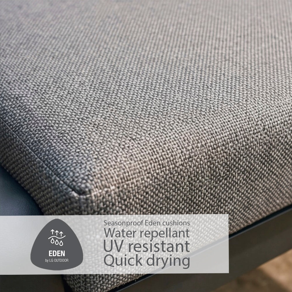 The cushions on our dining and lounge sets come with three multi-functional features making them super-durable for outdoor use.At LG Outdoor we know how unpredictable the summer weather can be, that’s why our eden Season-proof Cushions are water-repellent as well as quick drying, so you can leave them outside during those annoying summer showers. And for prolonged outdoor use they’re also UV resistant. Unlike other waterproof cushions, eden SeasonProof Cushions are soft to the touch, and super-comfortable thanks to our natural-feel fabric.