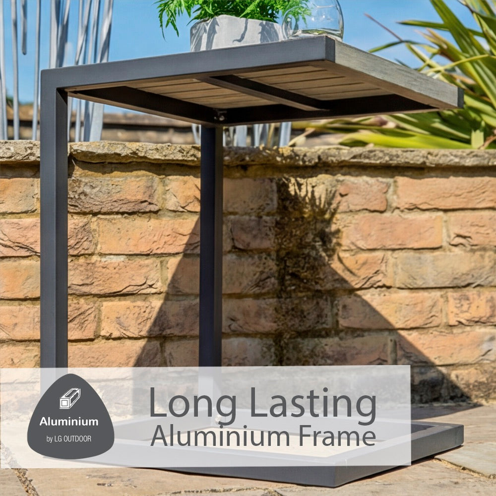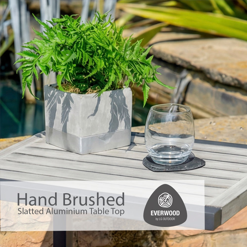 The Turin aluminium collection blends contemporary graphite-grey frames with wood-effect aluminium tabletops, creating a modern, maintenance-free range. Each tabletop is hand-brushed and slatted to deliver a highly realistic wood appearance with the durability of aluminium.