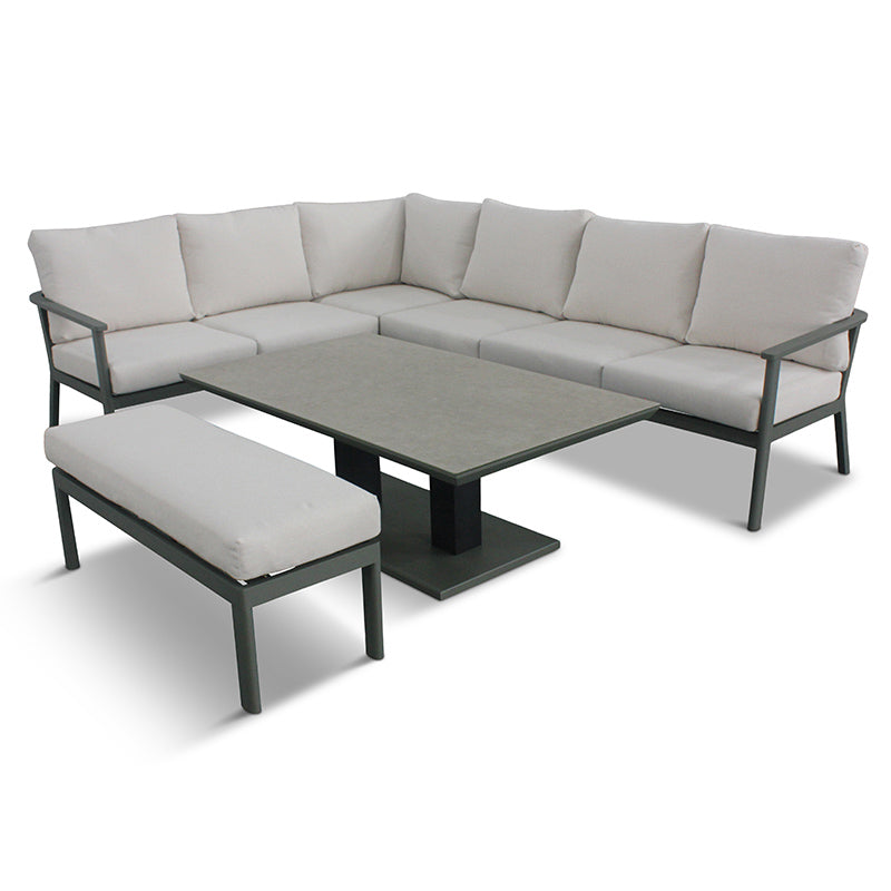 The Tuscany Rectangular Modular Dining Set with Adjustable Table features modular sofas, with deep cushions and large footstool, and adjustable 90 x 140cm stone effect table.